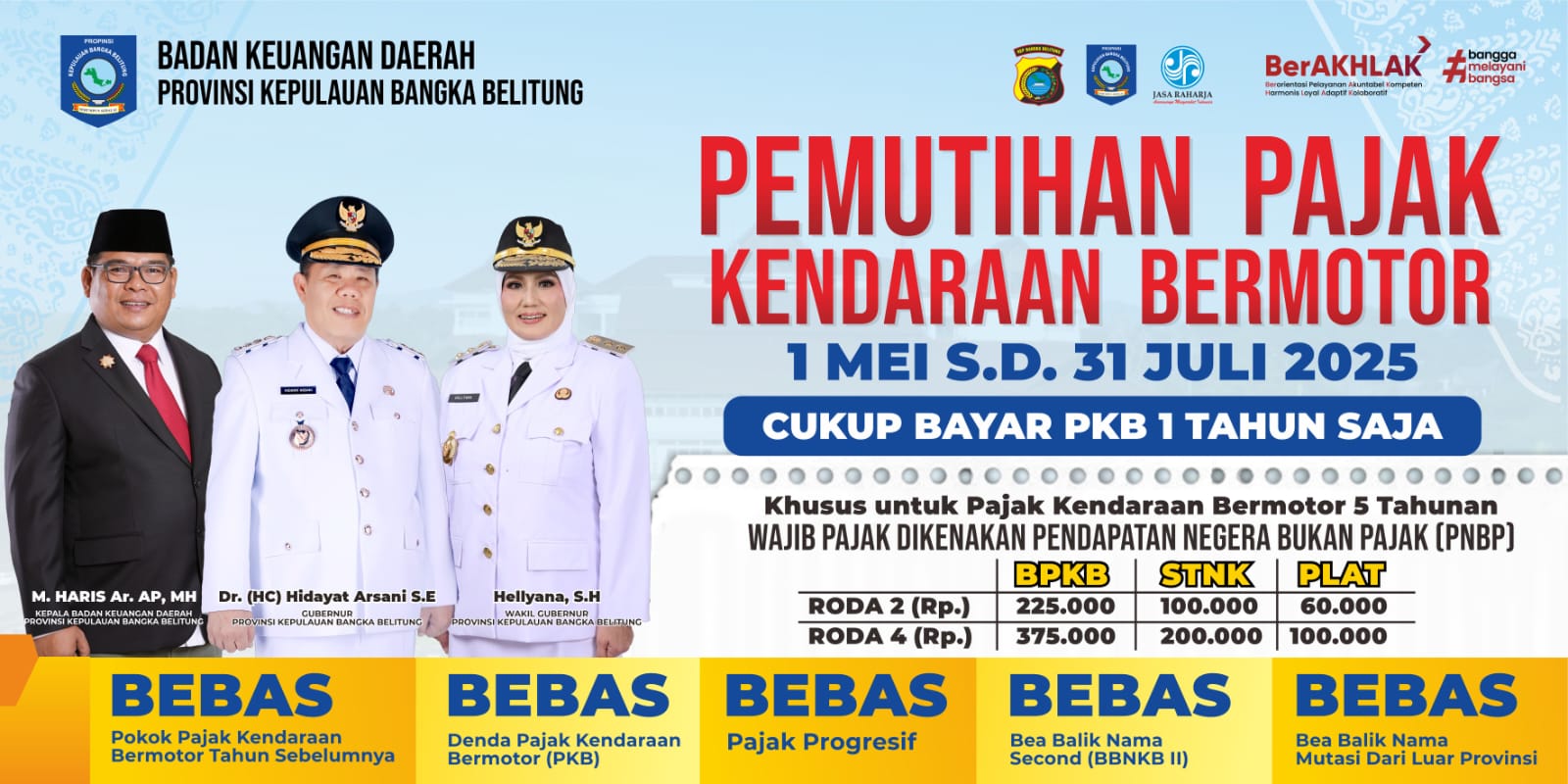 PANGKALPINANG, INLENS.id — Pemerintah Provinsi Kepulauan Bangka Belitung (Pemprov Babel) resmi memberlakukan program pemutihan pajak kendaraan bermotor (PKB) mulai 1 Mei hingga 31 Juli 2025. Kebijakan ini berlaku untuk seluruh pemilik kendaraan roda dua dan roda empat di wilayah Kepulauan Bangka Belitung.