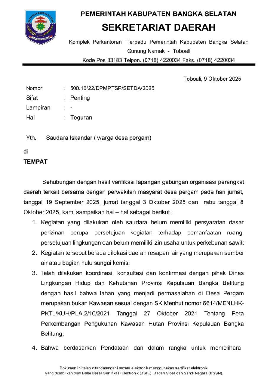 PANGKALPINANG, INLENS.id – Pemerintah Kabupaten Bangka Selatan melayangkan surat teguran keras kepada Iskandar, warga Desa Pergam, yang membuka dan mengelola perkebunan sawit tanpa izin di kawasan resapan air.